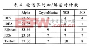 由于可编程密码处理器体系结构支持5条指令绑定并行执行,因此其数据路径定义为5CS(5Combining-Strands),假设不采用绑定的数据路径定义为NCS(No-Combining-Strands),将这两种情况与Alpha处理器、Cryp-toManiac密码处理器[9]路程进行比较,四种数据路径下加/解密所需时钟数如表4所示。分析比较表明可编程密码处理器执行时钟大量减少,尤其与通用处理器Al-pha相比,加/解时钟数DES算法减少83%,IDEA算法减少92%,Rijndael算法减少9l%,RC6算法减少69%,Twofish算法减少78%。