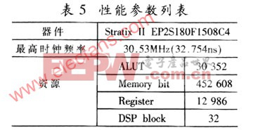 为了验证可编程密码处理器体系结构实现数据通路和控制通路的正确性,使用Altera StraTIxlIEP2S180F1508C4器件作为FPCA目标芯片,使用AlteraQuartusII 5.0工具进行综合,在综合前和综合后使用Mentor公司的ModelSim 5.8c分别进行功能仿真和时序仿真,结果均正确。其具体资源占用情况如表5所示。