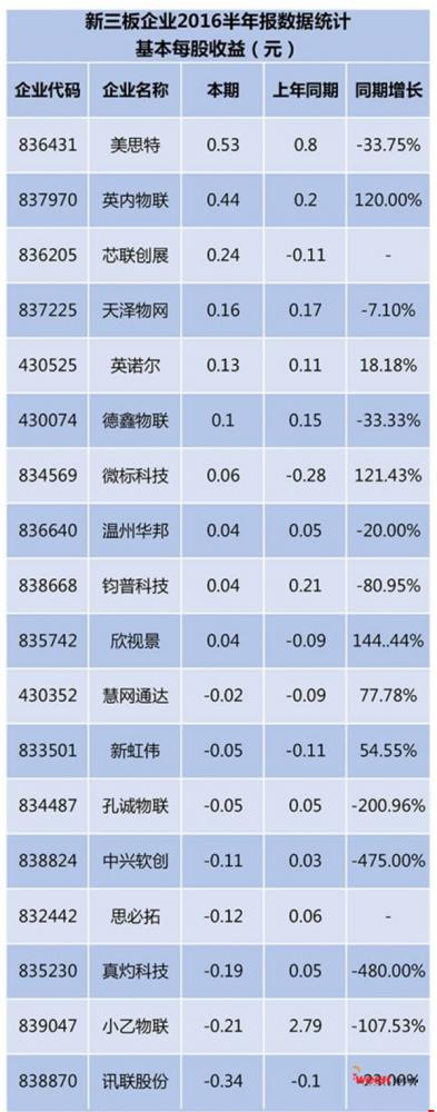 每股净收益是衡量上市企业质地好坏最重要指标,上半年每股收益超过0.2元总仅有三家,美思特、英内物联、芯联创展,但值得关注的是英内物联每股收益同期增长1倍以上,实现0.44元,确实发展势头很猛,而美思特同期比下滑的比较明显。另外,有同期相比增多的有6家,其欣视景、微标科技、英诺尔也有明显增长分别是144..44%、121.43%、18.18%;而同期相比每股收益减少的有10家,其中真灼科技、中兴软创、孔诚物联、小乙物联科技较为明显,分别是-480.00%、-475.00%、-200.96%、-107.53%。