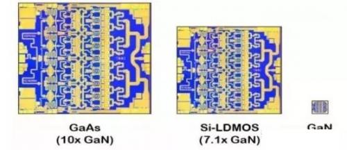 GaAs、 Si-LDMOS、 GaN 方案面积对比(source:Qorvo)