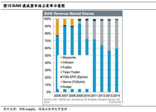 传统的SAW滤波器领域市场已趋向饱和,Muruta、TDK和Taiyo Yuden占据了全球市场份额的80%以上,升级替代产品BAW滤波器近来成为市场焦点,成为MEMS市场的中增长最快的细分产品,根据市场分析机构IHS Supply的调研结果,当前BAW的核心技术主要掌握在Avago(Broadcom)和Qorvo手中,两家公司几乎瓜分了全部市场份额,如图10所示。