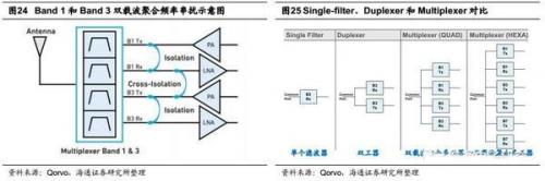 载波聚合数量的成倍增长为射频前端芯片的设计带来了新的挑战,其中最大的挑战是串扰问题。以中国境内FDD-LTE系统广泛应用的Band 1和Band 3双载波聚合方案为例,如图24所示,当使用载波聚合方案时,Band 1 Tx/Rx和Band 1 Tx/Rx同时工作,由于Band 1和Band 3频率接近,因此除了需要防止同一频段内部发射和接收通路之间的相互干扰之外,还需要防止不同频段之间信号的互相干扰,为了解决这个问题,需要将传统的Filter和Duplexer技术升级为Multiplexer(多工器)技术,将全部载波聚合频率的发射和接收滤波器集成到同一器件中,以便进行协同设计和匹配,以满足性能要求。