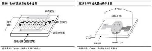 工业界普遍认为,在低于1.5GHz的应用场景中,SAW滤波器的性能通常可以满足系统要求,同时由于成本更加低廉,依然会得到广泛应用。而在高于1.5GHz的应用场景中,BAW滤波器的优势将会十分明显。图27给出了BAW滤波器的结构示意图,和SAW滤波器不同的是,在BAW滤波器中,声波是沿垂直于衬底方向传播的,金属极板分别被放置在压电材料的上下两侧,谐振频率主要由压电材料的厚度决定,这种结构使BAW滤波器在高频应用时仍拥有较高的Q值,最高工作频率可以达到6GHz。