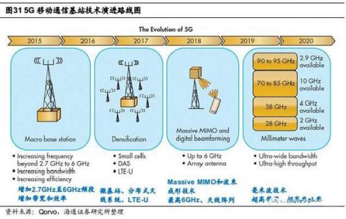 总结来看,5G时代的三大核心技术对基站射频功率器件提出的要求有:高频率、高效率、高带宽、高线性度、小尺寸、良好的散热能力、可在多种电压域下进行工作,这与GaN工艺的特点完美契合。图31给出了5G移动通信基站的技术演进路线图,可以看到,微基站、分布式天线系统(Distributed Antenna System,DAS)、Massive MIMO和波束成形将最早落地,预计对射频前端市场的影响在2018年就会有明显体现,而毫米波从研发到应用具有更长的时间周期,属于长期利好。