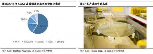 根据市场调查公司Strategy Analysis的数据,2015年初时全球最大的GaAs晶圆制造厂为台湾稳懋(Win semiconductors),市占率高达58.7%,当时尚未同RFMD合并的TriQuint排名第二,接下来依次是台湾宏捷科(AWSC)和台湾上市公司GCS(环宇),如图36所示。