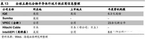 目前全球主要的外延片供应商主要位于英国、日本、美国和台湾。市场调查机构Stategy Analysis的数据显示,近年来全球化合物外延片市场的近80%份额被IQE和VPEC(全新)占据,其中IQE市场份额约60%,VPEC(全新)市场份额约20%。全球主要化合物半导体外延片供应商信息如表13所示: