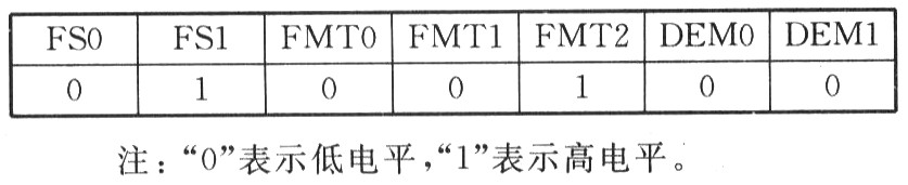PCM4104分为软件配置和硬件配置,本设计采用硬件配置。其中引脚FSO、FSl用于配置采样模式;FMTO、FMTl、FMT2用于选择接收数字音频信号的格式;DEM0、DEMl用于选择去加重。其配置如下:
