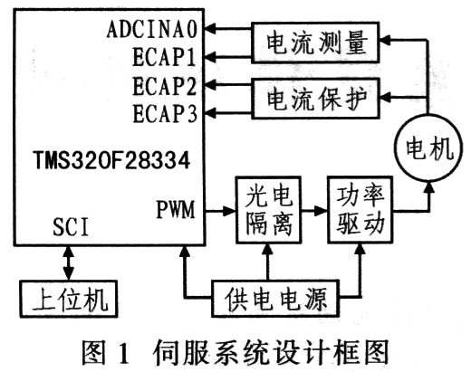对于伺服系统,相电流采样精度直接影响整个伺服系统的性能。因此采样电路和保护电路都是围绕电流环内的电流值设计。F28334处理和比较采样得到的电流,进而输出PWM波进行相应控制。系统框图如图l所示。