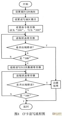 读写扇区时,首先需要设置起始扇区的LBA地址和扇区数目,并设置命令寄存器,读取数据设置命令"20H",写入数据设置命令"30H"。然后读取状态寄存器,判断状态寄存器是否为"58H"。若为是,则开始读写操作;若为否则继续读取状态寄存器。接下来读状态寄存器是否为"50H",判断CF卡操作是否完成。若为否,则继续读取判断;若为是,则结束读写过程。如果在判断状态寄存器中发生了超时或出现错误,则设置超时或错误标志,并跳出读写过程。图4为CF卡读写一个扇区的流程图。