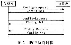 在PPPoE Session阶段,PPPoE除数据传输以外,还提供了链路的协商(LCP),以及网络层的控制协商(IPCP)等其他服务。对于LCP,它主要用于配置和测试数据通信链路,用来协商PPP协议的一些配置参数选项;处理不同大小的数据帧:检测链路环路和一些链路的错误;终止一条链路,其作用类似于IP层的ICMP协议。而对于IPCP,它主要用于动态地协商客户机与服务器双方IP,实际的数据报文交换过程中主要涉及Config-Request、Config-Ack、Config-Nak和Config-Re-ject。图2描述IPCP协商IP的过程。