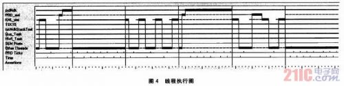 在DSP/BIOS中,可以通过线程执行图分析各个线程的执行情况。本系统的线程执行图如图4所示。