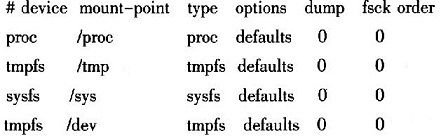 文件中各字段的意义如下:1)device:要挂接的设备,如/dev/mtdblockl;2)mount-point:挂接点;3)type:文件系统类型;4)opt-ions:挂接参数,以逗号隔开;5)dump和fsck order:用来决定控制dump、fsck程序的行为。