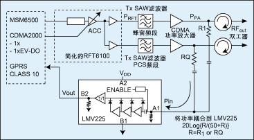 图2中的射频发射电路架构可以用于很多种不同的CDMA芯片组。图3是一个为CDMA20001X或EV-DO单波段手持设备发射功率检测而推荐的LMV225应用简图。在这种发射器结构中,输出到天线的功率为: