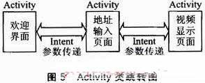 Android程序一般由多个Activity、Intent、Content Provider、Service等程序框架组成,其中最基础的是Activity活动类,该类相当于软件运行时的一个页面,在页面之上可添加各种控件,如button按键、ImageView图片、Text boxes、Lists列表等。除此以外还负责监听系统事件,负责启动其他的Activity类。在多个Activity类之间跳转就需要用到Intent类,Intent类有两个重要部分:动作和动作对应的数据。常用的动作有MAIN、VIEW、PICK、EDIT等,动作数据则以URI形式表示。通过Intent类还能传递参数,作用类似链条串起Activity类,Activity类跳转图如图5所示。