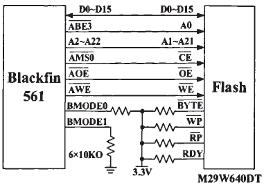 ADSP-BF561具有异步存储器控制器(AMc),与SDRAM控制器共享数据和地址引脚。当上电复位或者软件初始化复位后.处理器采样复位配置寄存器BMODE引脚,执行引导功能。系统采用BMODEIO为由8116位Flash引导模式,并选用NORFLASH作为引导代码存储器,所选芯片为容量8MB的M29W640DT.其连接方式如图2(b)所示。