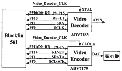 ADSP-BF561提供两个可直接与并行A/D和D/A转换器、符合ITU-601/656标准的视频编码和解码器以及与其他通用外设连接的并行接13(PPI),每个PPI包括一个专用时钟引脚,由时钟电路产生。3个帧同步引脚和16个数据引脚。通过视频解码器ADV7183与ADSP-BF561的PPl0连接.视频编码器ADV7179与ADSP-BF561的PPll连接.从而实现车辆辅助驾驶系统中的环境感知传感和人机界面功能.其连接如图3所示。