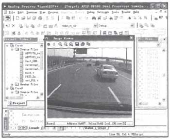 系统的硬件设计是后续代码编写和算法实现的基础.因此完成上述系统的硬件开发后,编写底层驱动模块和系统软件框架,并把视觉处理算法进行相关移植。ADI公司提供一套完整的软件开发工具Visual DSP++,利用Visual DsP++项目管理环境,程序员可以方便的开发和调试应用程序,同时开发软件的编译器能有效地将C,C十+代码转换为Blackfin DSP的汇编代码.采集结果如图4(a)所示。
