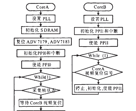 ADSP-BF561为对称双核处理器,因此在程序编写的时采用不同内核处理不同工作,并根据硬件接口进行调试软件的编写.CoreA工作主要包括设置时钟频率、初始化SDRAM控制器、初始化视频编解码器、初始化PPl0和中断、使能PPIO.以ITU656模式进行获取,获取到的帧存放在SDRAM中:CoreB工作主要包括设置时钟频率、初始化PPI1和中断、使能PPI1,以通用输出模式执行视频输出,软件流程如图4(b)所示。