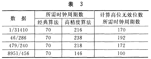 表3中的时钟周期指的是DSP的机器时钟周期。由表3可以发现高精度算法对于不同的数据所需的周期数是不一样的,而且算法中计算被除数和除数的高位无效位数占用了大部分的周期数。
