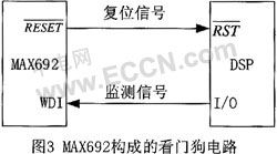 掉电判别、看门狗监控等功能。其中WDI是看门狗检测输入端,接到DSP的一个专用I/O口或一个总线口上。是复位信号输出端,接DSP的复位端。MAX692的WDI定时周期为1.6s,复位脉冲宽度是200ms。如果WDI保持高或低超过"看门狗"定时周期(1.6s),端将发生200ms宽(最小140ms)的负脉冲使DSP复位。
