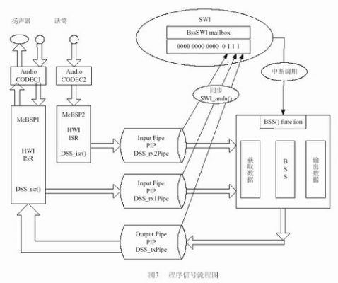 在本系统中,需要用DSP/BIOS II的配置工具来配置生成一个软件中断(BssSWI)、三个PIP对象(DSS_rx1Pipe、DSS_rx2Pipe和DSS_txPipe)、一个硬件中断(HWI)。BssSWI实现BSS。三个PIP对象完成与语音编解码芯片相连接的串口和软件中断之间的数据交换,语音编解码芯片采集到的两路语音数据流向串口,然后经DSS_rx1Pipe和DSS_rx2Pipe送到软件中断,软件中断对两路信号进行盲分离(BSS),然后将分离出来的信号DSS_txPipe送回串口ISR,最后送到语音编解码芯片输出。程序信号流程图如图3所示。