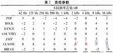 (2)均衡器音效测试。系统可以提供7种音效供用户选择,其中有POP、ROCK、DANCE、COUNTRY、JAZZ、CLASSIC和BRUCE。它们都是对音频信号的不同频段进行放大或衰减,以达到不同的音质效果。每一种音效的各个频段的增益如表2所示。