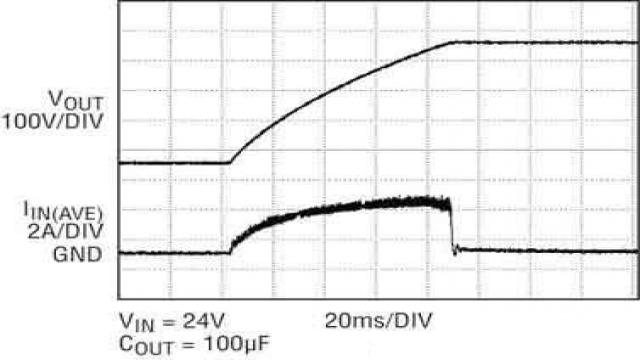 其中,VOUT是输出跳变电压,VRIPPLE是输出纹波电压,freq是充电/放电频率。通过让变压器体积加大和提供强制空气冷却,可以提高最大可用输出功率。对于输出电压高于450V的情况而言,必须用一个有更高匝数比和更高主端电感的变压器取代图1中的变压器。图2显示一个在不到100ms时间内充电到400V的100μF输出电容器的充电波形和平均输入电流。