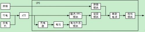 在这种直流UPS体系里面,不存在交流UPS中的旁路回路了,只存在一个市电到电池回路,这个回路也兼有充电器的作用。因此从单个UPS的可用靠性角度考虑,直流UPS可靠性链路只有两条,其中一条是两级变换加上辅助电源与控制板,另外一条是电池,见下图所示