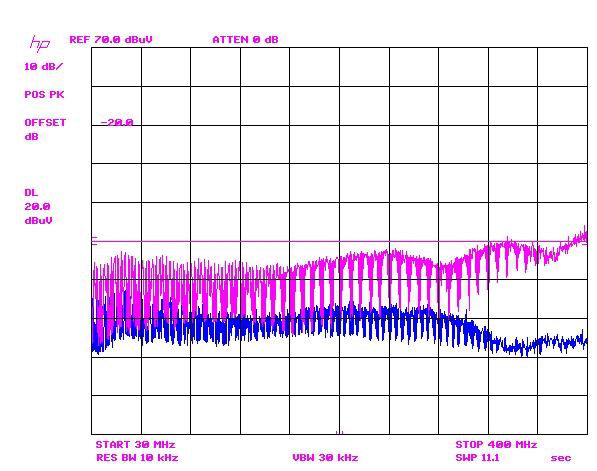 图 2:蓝色扫迹为噪声层;红色扫迹是 LT8614 演示板在一个吸波暗室中的 CISPR25 辐射测量值。