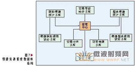 频谱资源管理的数据库将包含了若干个子库,如图7所示。数据库通过对资源空间的感知信息的分析处理,对频谱的使用状况做出详实描述,根据非授权用户的需求,形成资源图谱。各个子库之间可以产生如下关系:频谱原始使用状态子库为原始频谱统计子库提供服务,频谱整体使用状态子库为整体频谱统计子库提供服务,而空洞分析子库、空洞等级标示子库、功率梯度子库等子库以及原始频谱统计子库和整体频谱统计子库都是为管理中心服务的。