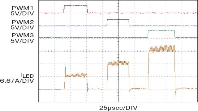 3 种不同电流状态之间的 PWM 调光如图 5 和图 6 所示。在图 5 中,PWM 信号顺序接通和断开。PWM3 的优先级最高,PWM1 则最低。这允许单一输入信号快速转换,以改变输出电流。如图 6 所示,PWM 输入信号之间可以有任意长短的时间间隔。