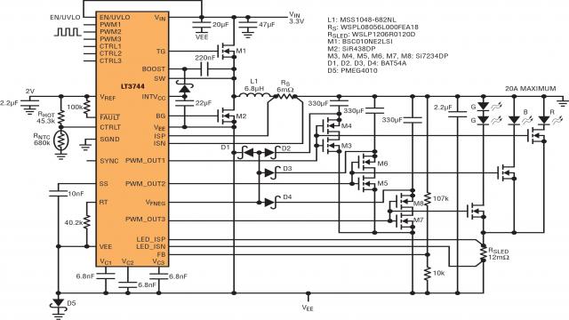 每个 LED 都可以顺序接通,相互之间有一定的时间延迟,或者按照提供给 PWM 数字输入的任何模式接通。此外,凭借 3 个独立的模拟控制输入,每个 LED 都能够以不同的稳定电流运行。当 LT3744 配置为负输出降压-升压型转换器时,单节锂离子电池仅用单个控制器就可以驱动 3 个独立的 LED 串。图 7 显示了一个专门为 RGB 微型投影仪设计的 3.3V/5A 负输出、3 色、降压-升压型 LED 驱动器。