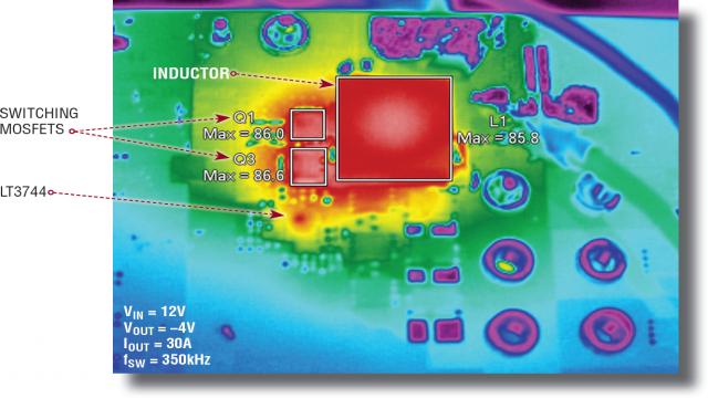 图 15 显示,向并联负输出降压-升压型应用中的 LED 提供 30A 电流时,组件温度的上升情况。