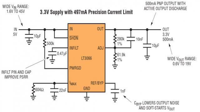 LT3066 采用小型、低成本、最低 3.3µF 的陶瓷输出电容器工作。该器件的 PWRGD 标记指示输出处于稳定状态。LT3066 用一个电阻器精确设定外部电流限制 (在整个温度范围内为 ±10%)。此外,LT3066 的内部保护电路包括电池反向保护、电流反向保护、折返电流限制和过热限制。主动放电电路提供安全工作区 (SOA) 折返功能,以保护下拉 NMOS,使 OUT 电压高于 6V,并提供范围很宽的 OUT 引脚绝对最大额定值:-1V 至 +20V。如图 1 所示,该器件具很宽的输入和输出电压范围、快速瞬态响应以及 64µA (工作时) 和 <3µA (停机时) 的低静态电流,因此成为工业电源、航空电子系统电源、汽车电源、需要最佳运行时间的电池供电型系统及仪器、以及需要提供广泛保护的高可靠性电源之出色选择。