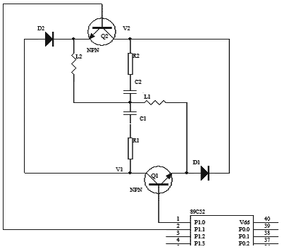 本实验中,选用两个小功率NPN管C1815(Q1、Q2)来替代开关管,用89C51芯片的P1.0和P1.1脚控制Q1、Q2的开关。同时,蓄电池的端电压V1和V2由差动放大电路采集,经A/D转换送到CPU。在整个过程中,电压每20ms采样一次,每隔1s上传上位机并保存并自动绘制曲线。图5为试验电路图。