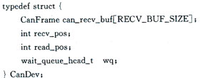 其中,can_recv_buf为接收CAN报文帧环形数据缓冲区,recv_pos和read_pos分别表示数据存入和读出缓冲区的位置;wq定义的是一个等待队列,用于实现阻塞型read操作。