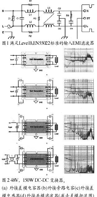 图2a左边图所示的48V输入DC-DC转换器的输入有一个差模电容器C1。这个单模电解电容器(120mF,100V),用于确保低输入阻抗稳定和良好的瞬态响应。此电容器是转换器的能量储存器。为得到最大效益,此电容器必须尽可能地靠近模块的输入引脚。