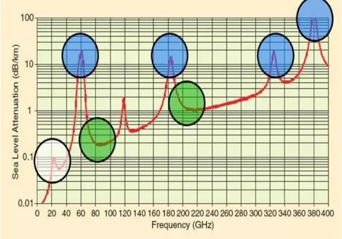▲毫米波频率范围的大气吸收率(以dB/km为单位)