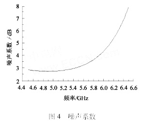 在5.1~5.8GHz频段内,LNA的噪声系数为2.75~3.65dB(图4)。这样低的噪声系数在WLAN宽带应用中是可以被接受的。