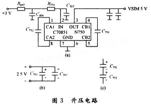 在手机读卡电路上要用到5 V的电压,而手机所用电池早期为4.8 V,现在的手机均为3.6 V,因电池电压往往随所剩电量的多少有所变化,为确保手机工作稳定,不因电池电压的变化而影响通话质量,电池电压并未直接供给手机各部分使用,而是通过稳压IC变为3.2 V,2.8 V,3 V等更低的电压供各部分使用。在这种情况下就需要通过升压电路将3 V左右的电压升为5 V。如图3(a)所示,是用在爱立信788手机上的升压电路。