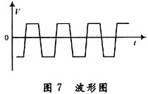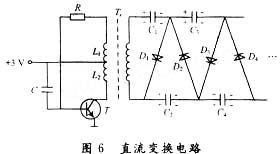 如图6所示,是在小型电器中常用的DC-AC-DC直流变换电路。晶体管T与定时电容C,电阻R以及变压器Tr的初级带抽头的线圈L1,L2构成振荡电路,使T处于开关状态。故L2上流过的是直流脉冲,该部分使用的电源约为3 V,振荡电路工作后,L2上会出现峰值为3 V左右,频率约30 kHz的脉冲电压,波形如图7所示。