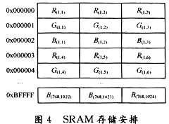D/AtaCapture模块负责将输入的数据按一定的格式顺序存放到SRAM中。每个时钟从AD9887A板过来的数据是24位的RGB数据,8位红,8位绿,8位蓝,而实际输出的时候是按照1帧红1帧绿1帧蓝的顺序输出的。因此如果能将读入的24位RGB数据按照一定的格式存放,就可以方便的读取数据,格式如图5所示。
