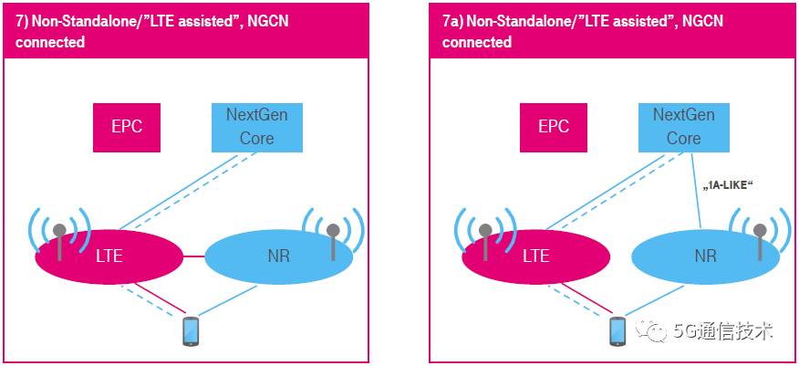 7) 非独立(NSA),LTE辅助,仅连接到5G核心网(NGCN)。