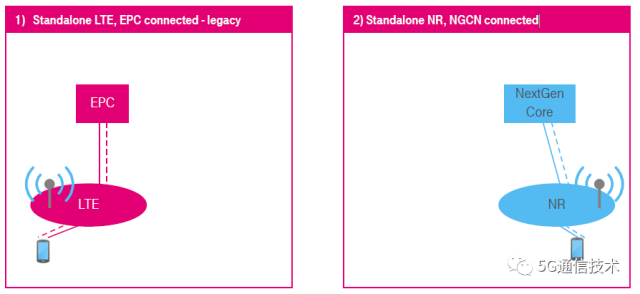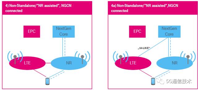 4 ) 非独立(NSA),5G新无线系统辅助,仅连接到5G核心网(NGCN)。