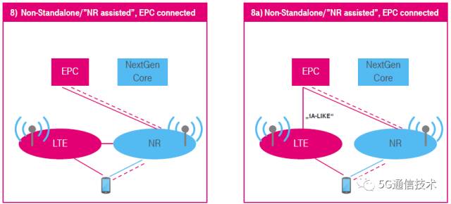 8) 非独立(NSA),5G无线系统辅助,仅连接到EPC。
