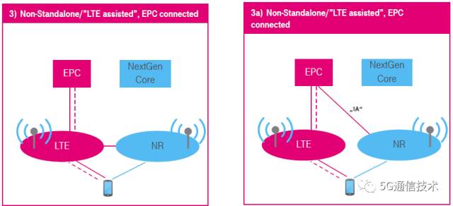 3 ) 非独立(Non-Standalone,简称NSA),LTE辅助(即控制信令走LTE),仅连接到EPC。