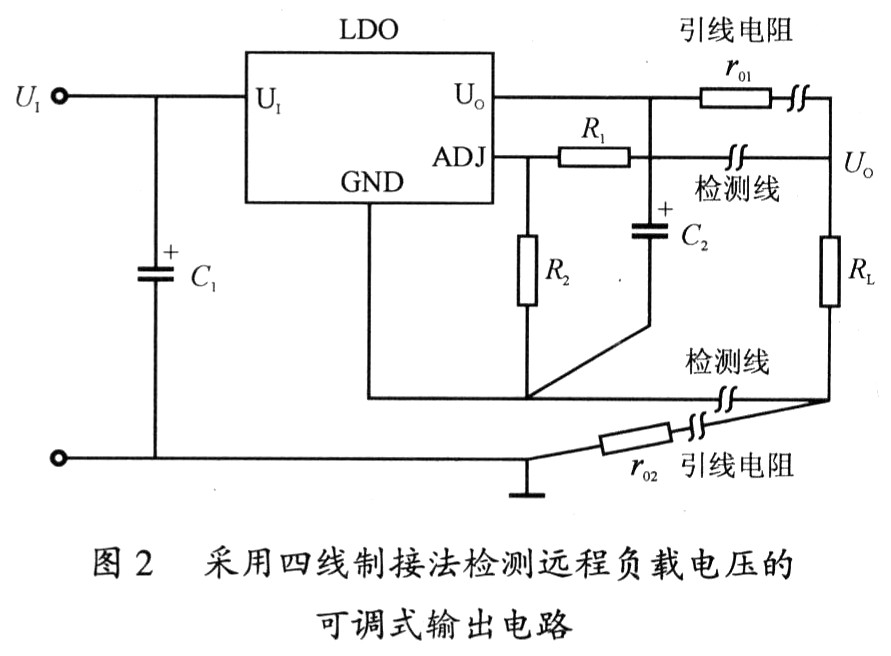 LDO的两条输出引线电阻(r01和r02),会造成不必要的压降,影响对负载的调整。解决的方法是适当增加印制导线的宽度以减小引线电阻值。当负载距离LDO很远时,长引线还极易引起噪声。为了准确检测远程负载上的电压,建议采用四线制接法,亦称开尔文(Kelvin)接法,可调式输出电路如图2所示。该电路的特点是增加了两条细导线作为检测线,直接将负载R。上的电压引到取样电阻分压器R1和R2的两端。由于取样电阻的阻值较大,细导线上通过的电流很小,所形成的压降可忽略不计,因此能准确检测输出电压值。尽管原来的引线电阻r01和R02仍与负载串联,但r02未包含在检测电路中,因此所形成的压降并不影响检测精度。