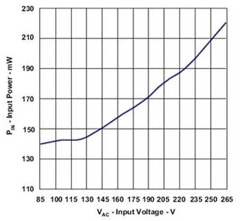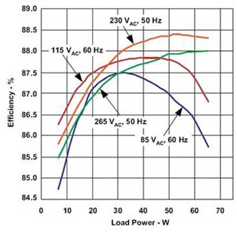总之,更严格的节能标准要求创新的电源技术,电源需要在整个负载范围内都有很高的效率,并可极大节约能源。基于负载条件,操作不同模式下的使用准谐振控制和跳脉冲技术的反激式变换器可阐明它对AC/DC应用中的节能进行优化的有效性。新开发的IC(如TI推出的UCC28600)是符合新节能标准的最优解决方案之一。图3提供了效率的典型测试结果,而图4则显示了在连接于通用离线输入(带单一18Vdc输出)的65W反激式变换器中使用UCC28600的准谐振控制和跳脉冲技术的待机功率。