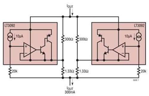图8 并联电流源以扩散热量并实现更大的输出电流 这些由铜线组成的稳流电阻的两端压差大约为8mV。铜线的温度系数为每度0.3%,而这将影响整个电流源的温度系数。将基准电压从200mV提高到1V将使稳流电阻上的电压所占比例更小,而且就100℃的温度变化而言,这种影响将从大约1% 降低到0.2%。