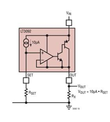 图9 电压变化电路 LT3092也可充当一个无需输出电容器的稳压器。"本质安全"应用常常用低电流与小电容(或不用电容器)来设计。图10显示了一个200mA的稳压器。而作为一个稳压器,在LT3092内部产生的10μA电流将流过一个外部RSET电阻器。SET引脚上施加的电压为该10μA电流与RSET阻值的乘积。内部电压跟随器在输出引脚提供与设置引脚相同的电压。负载从输出引脚连接到地。